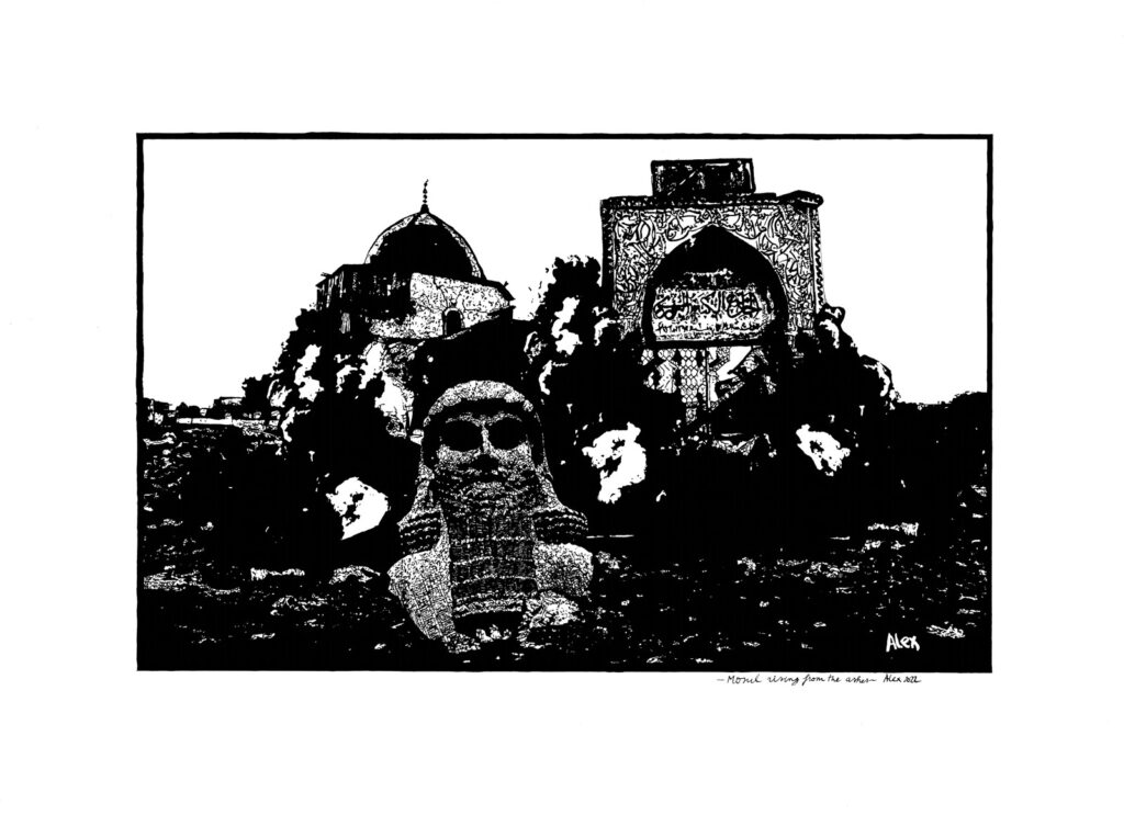 È evidente che ci sono temi ricorrenti nel mio lavoro, come l’orrore della guerra e l’intolleranza religiosa, come in “Mosul will rise again”, che mostra i criminali dell’ISIS che devastano la loro stessa terra, distruggendo intenzionalmente la magnifica moschea di Al-Nuri che si mostrava troppo bella ai loro occhi e distraeva i fedeli dall’Islam. Ho immaginato un antico eroe mesopotamico che risorge dall’antica Ninive (Mosul) per ripristinare la memoria nei suoi ignoranti discendenti.