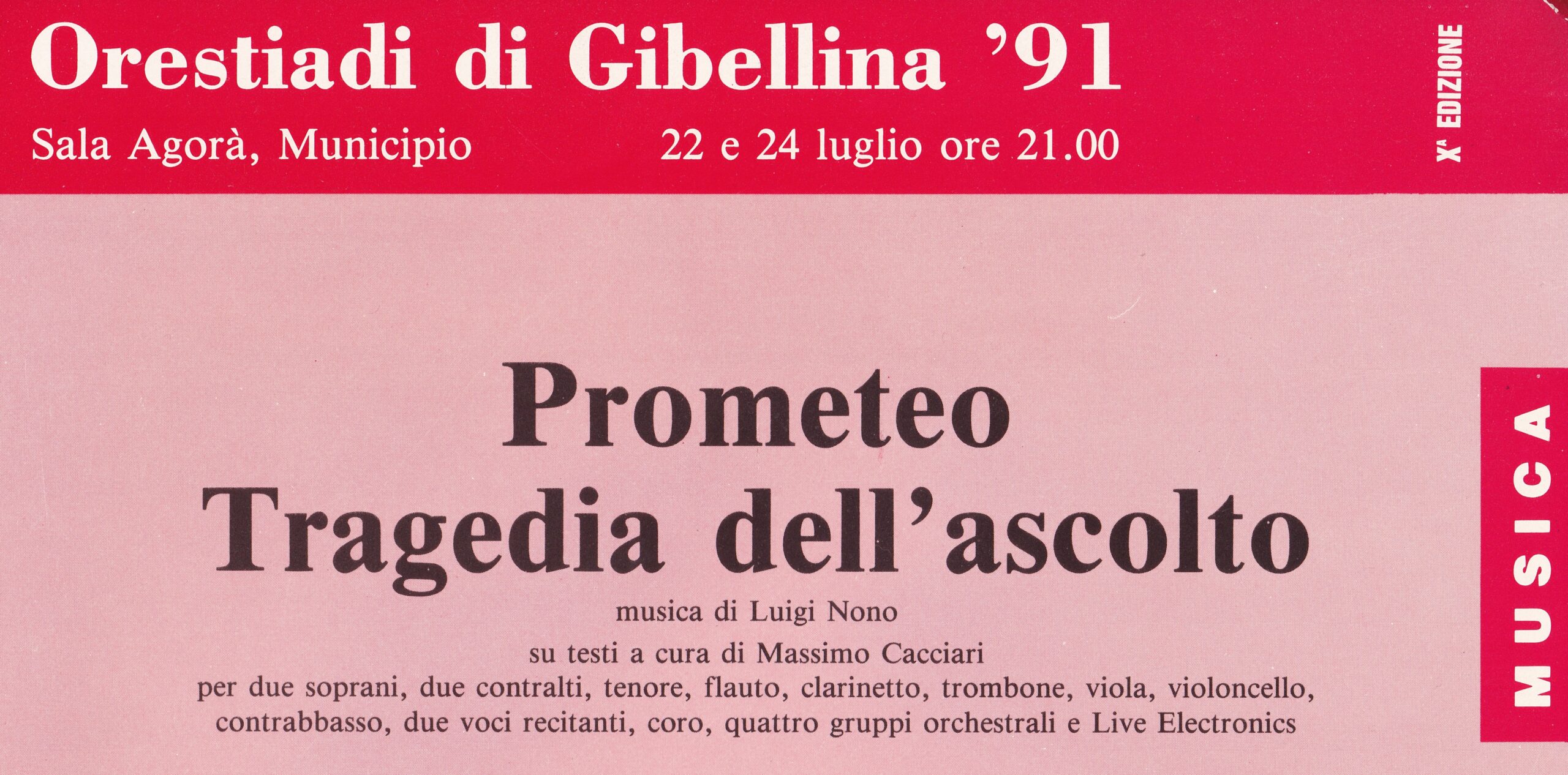 Nel 1991 Mario venne invitato dal sindaco di Gibellina a curare una sezione musicale delle Orestiadi ed anche in questa occasione una parte del programma venne riservato a lavori musicali con una rilevante presenza di tecnologia elettronica. Nel contesto particolare di questo Festival, in una cittadina ancora in fase di ricostruzione dopo il terremoto del Belice (1968) che la distrusse completamente, Mario con una notevole dose di coraggio realizzò un’esecuzione di Prometeo, tragedia dell’ascolto di Luigi Nono, ad un anno dalla scomparsa dell’autore. Come scrisse Mario nel catalogo del Festival16, la riproposta è dovuta ad una duplice considerazione: mi sembrava opportuno aprire questa rassegna con il testo più problematico degli Anni Ottanta e riprendere una composizione affidata in parte ad una “tradizione orale” e a quella che fu la presenza dello stesso Nono in veste di esecutore alla regia del suono. Si trattava dunque di recuperarne e conservarne la prassi esecutiva, grazie all’apporto insostituibile dei più vicini e fedeli collaboratori musicali di Nono, in vista della messa a punto di un progetto editoriale, curato da Ricordi, che consentirà di rendere “tramandabile” il Prometeo. Problematica, quest’ultima, che verrà affrontata, come vedremo, nel Festival della Biennale di Venezia del 1992 dedicato a Luigi Nono.