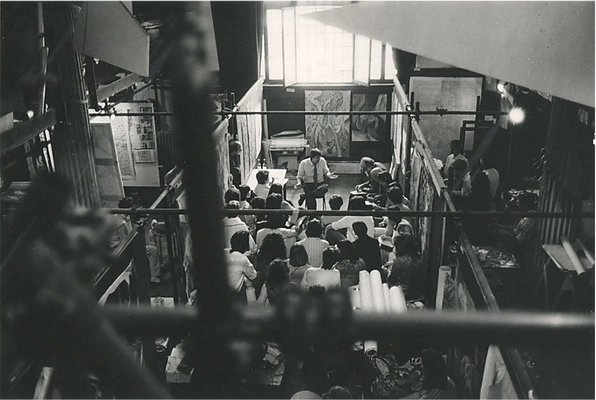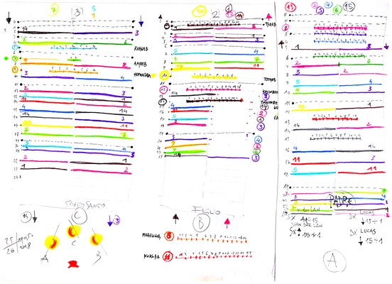 Poco si è approfondito sulla vera rivoluzione operata da Kandinskji nella sua composizione scenica (Voci, Figura nera, Il sipario viola sono le altre straordinarie opere del progetto di sintesi di tutte le arti): essa non è espressionista, ma dada. Almeno nel senso del dada originario, che si aprirà in un cafè di Zurigo. Ma dada è del ’16, il Suono giallo del ’12, anzi iniziato nel 1909, l’anno del manifesto futurista. L’opera prende senso solo se la inquadriamo come una profezia del nonsense, se affidiamo ad essa il primato di un totale rivolgimento della tradizione del testo e della scena. Attori ”marionette”, “zolle con domande colme di enigmi”, “sogni di pietra” … Bisogna attendere addirittura il surrealismo per rincontrare il paradosso e l’acidità ludica della provocazione assoluta. Per questo Kandinskij, con la sua immensa complessità, fu il fantasma che aleggiò nelle aule di Vedova e che avrà indiretta influenza anche su Gazzarri.