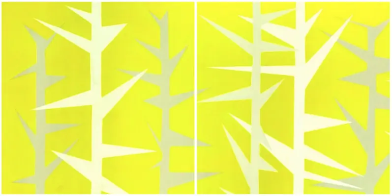 Le verticali spinose di Hazard 1 si ergono a protezione, ad interporre uno schermo tra lo spettatore e il fondo giallo, che finge l’oro del cielo. Sono figure intermediarie: vengono dall’oscurità, perdendo il nero pigmento che abitava le opere del maestro; le ali si fanno spighe di rinascita, vengono ad annunciare la fine del caos, la liberazione dall’istintivo e dall’istinto. Annunciano geo-metria, ordine e ritmo. Annunciano la Primavera, la stagione del grano dorato, della Spiga, dell’eterno ritorno. Su questo campo giallo che Gazzarri ha voluto ingenuamente rivivere ad Auvers, regna Mot, il dio fenicio della mietitura, che muore sull’aia con le sue Spighe, per rinascere nella futura stagione. Ma Mot, come ricorda Jean Luc Nancy, rimanda sia a parola (motto) sia a silenzio (muto). Il giallo è muto rispetto al sole, alla luce e al divino. Questo il tragico errore impressionista, di credere di poter rappresentare la luce mediante il colore. Questa, anche, l’estrema verità annunciata dai corvi sul campo di grano.