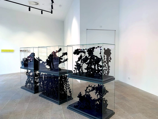 Ancora alla guerra, all’esperienza claustrofobica dell’assedio, alla brutalità delle armi e alla fuga dal nemico rinvia una seconda teca il cui titolo fa riferimento al film di Christopher Nolan del 2017 Dunkirk ambientato durante la seconda guerra mondiale, che racconta l’evacuazione di Dunkerque nel maggio del 1940, mentre alla straordinaria tela di Caravaggio Decollazione di San Giovanni Battista dipinta nel 1608 fa riferimento una terza teca. L’opera, come è noto, rappresenta la brutale esecuzione del Santo nella totale indifferenza morale del carceriere che assiste alla scena e del boia ed è lo stesso quadro di fronte al quale, dopo l’abbandono dell’isola di Malta da parte del Caravaggio poco dopo averlo terminato, fu letta la bolla con cui il pittore veniva radiato dall’ordine dei Cavalieri.