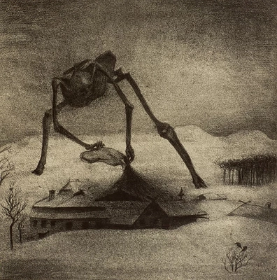 Ed ancora la menzione di un’opera di Alfred Kubin, Trauer del 1903 anno della morte dell’amatissima moglie dell’artista, che fu sempre esasperatamente sensibile ai temi della morte, del macabro, del dolore, dell’angoscia.