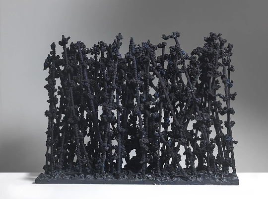 Sei scrigni proteggono le ultime prove dell’arte di Gazzarri, che evocano padri e maestri, ma come già suggerisce il titolo della prima opera, Kubin, Die Trauer 1903, soprattutto “lutto e dolore”, nel doppio significato che possiede la parola tedesca. Dedicate a capolavori di Kubin, Bosch, Caravaggio, Nolan, Dix e Villeneuve queste “sculture” sono deposte come offerta tragica ai piedi del Maestro. A Vedova è restituito il grido, l’Urschrei espressionista, ma non sotto forma di eco: qui la risposta si fa nemica. Appartiene all’arte dell’arcano. Rimanda al mondo primordiale, al mondo del notturno e dell’inconscio, al Die andere Seite, all’altra parte, uno dei romanzi più importanti di Kubin: là dove persino la perla si corrompe, il legno marcisce, il ferro arrugginisce, là dove comunque crescono fiori di palude che escono dal fango e dalla decomposizione. Tutto vi è morto eppure tutto mantiene forma.