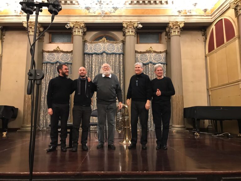 Centrale nella tematica del Festival dedicata ai Contemporanei e Allievi dell’opera di Luigi Nono, la serata dell’ 8 Novembre dedicata ad Helmut Lachenmann, allievo straordinariamente ‘unico’ e legato in un’affinità elettiva al compositore veneziano. Maestro indiscusso e ancora pienamente attivo con i suoi ottantasette anni della scena contemporanea internazionale, è arrivato a Venezia per partecipare alla Tavola rotonda dialogando con i musicologi Angela Ida De Benedictis e Roberto Calabretto e alla regista Wiebke Pöpel, autrice del film “MY WAY” dedicato a Lachenmann, che è stato proiettato al Cinema Rossini nella stessa serata dell’incontro. Altrettanto elettivo il ritorno del trombonista e tubista Giancarlo Schiaffini, protagonista fondamentale di quella bottega d’invenzione e ricerca strumentale che Luigi Nono mise a punto per la realizzazione del Prometeo Tragedia dell’ascolto e che vide attivi, assieme a Schiaffini, il flautista Roberto Fabbriciani, il contrabbassista Stefano Scodanibbio, il clarinettista Ciro Scarponi e Alvise Vidolin per l’avventura del live electronics. Proprio con la regia del suono di Vidolin, Giancarlo Schaiffini ha riproposto in concerto nella Sala Concerti del Conservatorio Benedetto Marcello alcune sue composizioni dedicate e ispirate a Nono e una delle ultime pagine composte dal compositore veneziano per la sua tuba, di grande suggestione, il Post-prae-ludium per Donau del 1987.