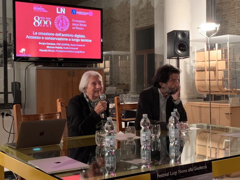 Il ricco cartello di eventi è stato aperto da un inaugurazione particolarmente significativa per la storia dell’Archivio Luigi Nono prossimo al suo trentennale, salutato con meritato orgoglio da Nuria Schoenberg Nono e Massimo Cacciari, ovvero la presentazione del completamento del lungo lavoro di Archiviazione digitale dell’intero fondo di documenti (partiture, dischi, registrazioni, video, foto, carteggi e documenti) ad opera del Centro di Sonologia e dal Dipartimento di Ingegneria dell’Informazione dell’Università di Padova con Audio Innova srl (Spin-off UNIPD), un progetto complesso e tecnologicamente innovativo per il libero accesso a tutti i materiali dell’Archivio, già avviato negli anni precedenti al Covid e curato e presentato da Claudia Vincis (Direttrice Scientifica della Fondazione Archivio Luigi Nono) assieme a Sergio Canazza (Direttore del Centro di Sonologia Computazionale dell’Università di Padova) e a Michele Patella, direttore tecnico di Audio Innova srl e finanziato dalla Ernst von Siemens Musikstiftung in collaborazione con la Paul Sacher Stiftung di Basilea.