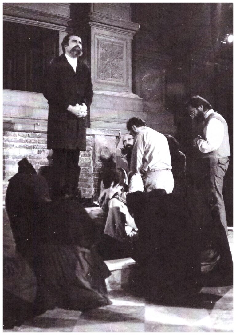 Le recensioni dello spettacolo parlano positivamente della musica di Nono, «stupenda e funzionale [che] ha arricchito [la rappresentazione] d’una componente efficace».9 Rodolfo Castiglione, nel ricordare l’evento sottolinea come Luigi Nono fosse stato estremamente disponibile nei confronti delle difficoltà che continuamente affioravano nelle fasi dell’allestimento. Allo stesso tempo conferma come la sua partitura, eseguita dal Coro del Teatro La Fenice di Venezia con la presenza di un ensemble di percussionisti sotto la direzione di Aldo Danieli,10 fosse concepita per adattarsi molto bene alle esigenze della scena.11 Tutti ricordano il felice incontro, e la sottesa emozione, fra una compagnia di teatro amatoriale, un ensemble di professionisti e un compositore come Nono. Lo spettacolo, allo stesso tempo, fu allestito lo stesso pomeriggio della rappresentazione. Eddi Bortolussi, attore nelle vesti del sacerdote, ricorda come nell’allestimento si fosse prestato a fare da ‘interprete’ del dialetto casarsese con gli interpreti, forte delle sue origini di San Vito al Tagliamento. Daniela Di Giusto ricorda come la regia di Castiglione fosse molto semplice ed essenziale e come la musica di Nono ben si addicesse a un simile spettacolo. Gianni Nistri, anch’egli partecipe a quello storico evento, sottolinea la grande affluenza di pubblico a tutte le rappresentazioni, in particolar modo a quelle nel territorio friulano dove la gente era emotivamente portata a ricordare i tragici eventi del maggio 1976 friulano.12