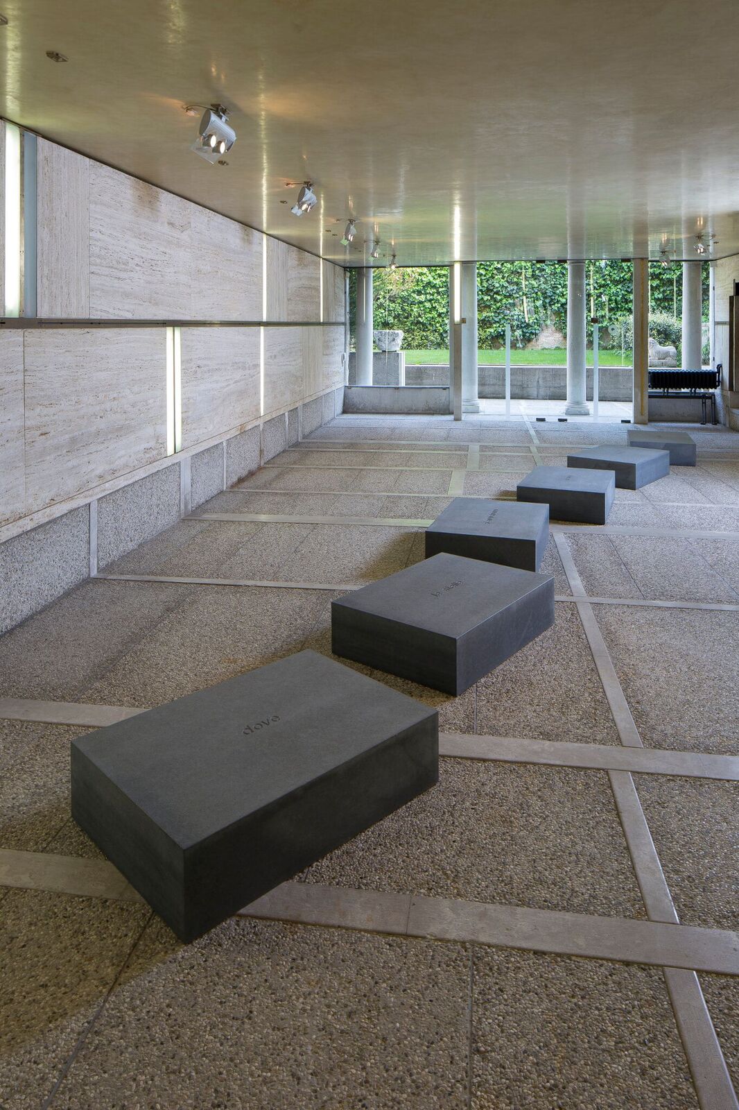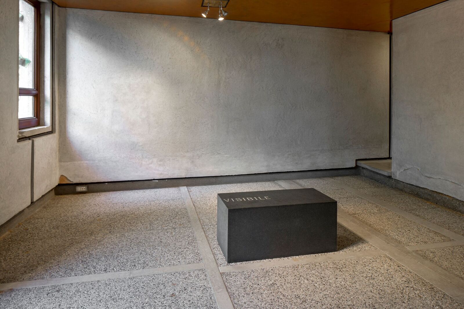 Nel suo ritmo di gradini e livelli, la pavimentazione di Scarpa procede oltre, conducendo al corridoio con finestrini angolati che forma un sipario dagli equilibri orientali e, infine, porta alla Sala Luzzatto. I muri ricoperti di travertino, la fuga della rotaia in ottone, il contrappunto dell’illuminazione e dei listelli bianchi della pavimentazione creano una stanza le cui proporzioni proiettano in una dimensione astratta che apre sullo splendido giardino. Lì Anselmo cambia ritmo, la posizione netta della prima opera trova ora un cadenza sinuosa e fratta, segue le tracce di un cammino incerto, segnate da blocchi di granito bruno. Come le passerelle di Scarpa, quei blocchi perfettamente squadrati servono da gradini, portano il visitatore a un’altra quota, ma quell’elevazione non è più funzionale all’architettura. Le singole parole incise in ciascun blocco – Dove le stelle si avvicinano di una spanna in più – guidano il percorso, offrendo una dimensione che supera l’architettura e i suoi volumi. Anselmo mostra una direzione diversa e rivela la finitezza del meraviglioso contenitore di Scarpa rispetto alla vastità del cosmo. Proprio il finito sarà l’ulteriore passaggio a cui l’artista conduce con la sua opera successiva: nella piccola saletta laterale appare un grande blocco di granito nero assoluto, perfettamente squadrato. La sua posizione si accorda con l’architettura, ne rispetta l’andamento, il disegno della pavimentazione. Scolpita nella faccia superiore del parallelepipedo appare la parola finito, impaginata lateralmente, come tronca del suffisso in. Prima di quella parola deve poter essere visto e pensato un in-finito che la scultura come l’architettura può solo evocare. Oltre quel blocco ieratico, la piccola stanza permette l’accesso a uno stretto corridoio che conduce all’antico ingresso del museo, dove Scarpa ha realizzato una preziosa pavimentazione ad intarsi. Angolata nell’atrio troviamo senza titolo (1967), semplice superficie plastica trasparente che Anselmo trasforma grazie all’energia elastica del foglio, stretto da un filo di ferro uncinato. Quella tensione trasforma il plexiglas, gli dà equilibrio. La torsione bloccata assume un andamento matematico, trasforma la muta inerzia della lastra in una lucida curva siderale, un’apparizione celeste tra i marmi policromi che richiamano le astratte geometrie e i colori dei tappeti orientali.