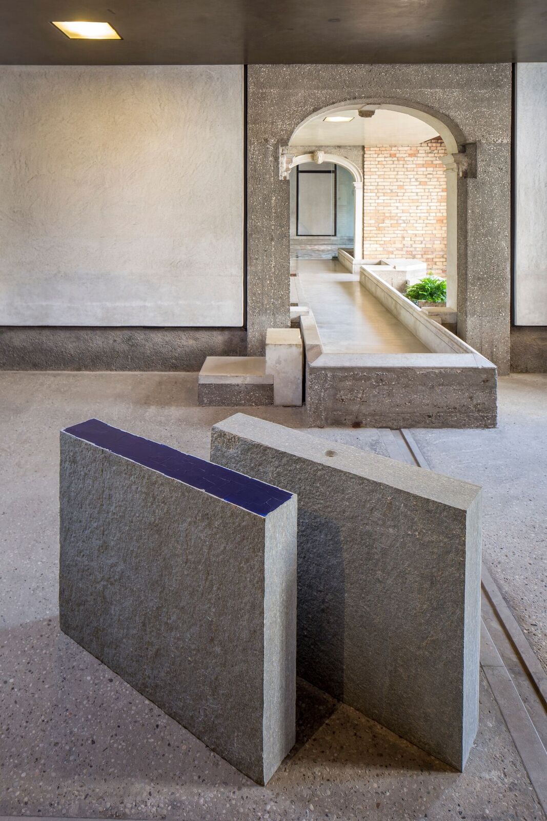 Le trasformazioni attuali hanno precedenti illustri, come il famoso restauro affidato a Carlo Scarpa tra gli anni Cinquanta e Sessanta, uno degli esempi più felici di contaminazione dell’antico realizzati in città. Proprio al pianterreno dell’area Scarpa il visitatore incontra la prima delle due mostre, quella di Giovanni Anselmo. Il confronto tra i due è straordinario perché l’artista piemontese condivide con l’architetto veneziano un’analoga attenzione ai materiali, anche se procede con una diversa logica espressiva. Nella sala colonne la prima installazione presenta due blocchi di pietra squadrati, paralleli, leggermente sfalsati. Per un sottile gioco di proporzioni quelle presenze granitiche risultano dinamiche, segni ritmici che offrono una direzione diversa rispetto all’andamento dell’architettura. L’opera si intitola Mentre oltremare appare verso Sud-Est: una minuscola bussola infissa in un blocco indica la direzione, l’altro porta uno strato di blu oltremare. Per Anselmo quel colore è il segno di un luogo che non è mai definitivamente raggiungibile; l’oltremare rimanda all’Oriente e ai mercanti che importavano i lapislazzuli, indispensabili per produrre il prezioso pigmento, o all’antica tradizione che vedeva in quelle pietre dei pezzi di cielo stellato, dono che gli dei avrebbero fatto agli uomini. L’Oriente è un riferimento comune, l’architetto lo traduce in un delicato equilibrio di piani e materie che conduce all’eleganza essenziale dei dettagli, mentre Anselmo, intercettando il campo magnetico terrestre, fa della pietra e del pigmento indicazioni di una dimensione cosmica, infinita, che si sprigiona da quei semplici blocchi e dal loro disporsi nella stanza.