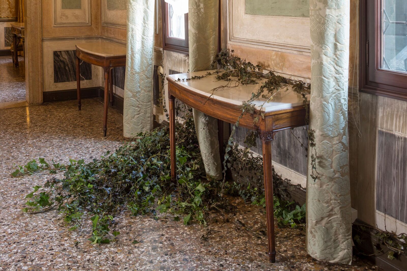 Salendo al secondo piano il visitatore entra in un’altra epoca, l’architettura rarefatta di Scarpa cede il posto alle decorazioni settecentesche della splendida casa-museo dei Querini. Nel portico d’ingresso un’ultima istallazione di Anselmo sembra annunciare il cambio di passo: sul battiscopa d’angolo il raggio di un proiettore disegna la parola particolare, quasi a suggerire come la mostra di Elisabetta Di Maggio richieda una diversa attenzione. Nelle opere dell’artista milanese non troveremo il sublime confronto tra la finitezza dell’uomo e l’immensità del cosmo ma un prolifico e inarrestabile germinare di forme. Nel portico quel germinare si manifesta subito, in tutta la sua rigogliosa presenza. Un groviglio d’edera si sprigiona dagli angoli della sala, emerge dalle consoles e dai sofà antichi, si distende sul terrazzo alla veneziana, s’inerpica lungo le cornici delle porte, circondando i busti, invadendo gli stucchi floreali. Alcuni tralci sono di un verde cinereo e caduco e rivelano intarsi misteriosi. Avvicinandosi ci si accorge che le foglie vive sono frammiste a rami recisi e stabilizzati, scolpiti dal paziente cesello del bisturi. Elisabetta Di Maggio lavora sulla natura come fosse una carta o un tessuto, la trasforma e la incide, producendo moderne grottesche che vanno a sovrapporsi alle antiche, come ha giustamente suggerito Germano Celant.