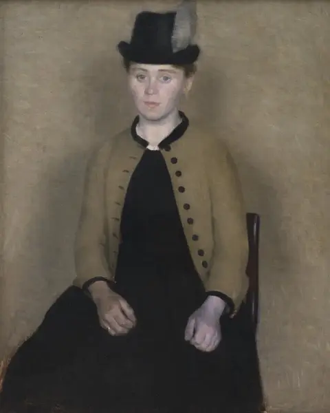 “Ritratto di Ida Ilsted” (1890) ritrae la futura moglie con un’inconsueta, trattenuta intensità. I suoi occhi cerulei sono impegnati in pensieri non detti, stagliati su uno sfondo neutro. Ida è seduta, e il colore della sua giacca si confonde con quello dello sfondo, sembra quasi affondarvi, trattenuta dalle mani strette in grembo in un moto di stizza o di chi si accinge ad alzarsi. La piuma e la foggia del suo cappellino evocano salotti e feste borghesi, ma il suo silenzio espressivo è di una lontananza siderale dal chiacchiericcio variopinto, ciarliero e mosso dei balli estivi e sorridenti tanto cari a Renoir, o dalla mestizia appassita della cameriera de “Il bar delle Folies-Bergère” (1882) di Manet. Ida ha le labbra serrate, appena richiuse, o forse in procinto di sbocciare in parole. Ha le mani contratte, “l’una di un bianco smorto, l’altra con una sfumatura verdastra. La ‘mano bianca’ richiama il volto pallido e incipriato della giovane, mentre la ‘mano verde’ riprende il colore della giacca” – come osserva A. Rosenvoldt Hvidt5.