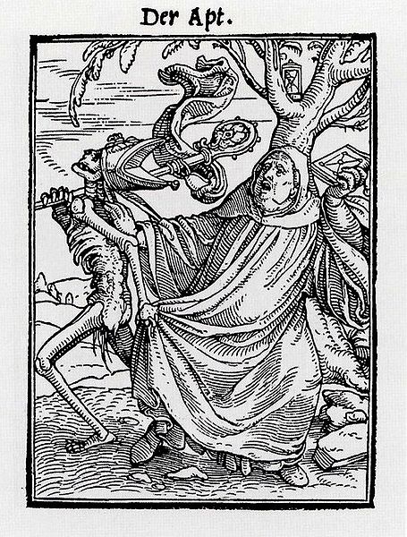 Per questo Holbein insistette così a fondo su questo tema, dando forma ad oltre quaranta Imagines mortis: la morte, raffigurata da un tetro e raccapricciante scheletro o addirittura da una serie di essi, giunge lieta, a volte perfino con tono canzonatorio e suonando allegramente qualche strumento musicale, ad afferrare per trascinare con sé papi, cardinali, vescovi, predicatori, abati, badesse, imperatori, re, alti dignitari di corte, cavalieri, medici, astronomi, mercanti, uomini ricchi e poveri, esponenti della borghesia e semplici contadini. Ed è lieta di fare quello che fa e, a volte, sembra perfino a dire il vero divertita: in fondo lo è perché, nell’accostarsi agli uomini, che con tutte le sostanze e le ricchezze accumulate durante l’intera vita si erano illusi di potere avere i mezzi necessari per far fronte ad ogni evenienza o imprevisto e riuscire così a vivere a lungo, svela il loro puerile inganno, e cioè quello di potere avere il controllo assoluto e totale sulla propria vita, sul proprio essere, di potere cioè essere loro a potere decidere quanto potere ancora vivere.