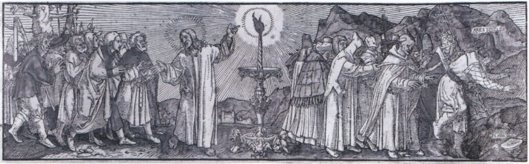 Che tutto ciò che ha a che fare con il divino, la salvezza dell’uomo e il suo destino post mortem non fosse per Holbein, potentemente sotto influsso luterano, che pensabile solamente ex Revelatione, e cioè, detto in altri termini, che humana mente l’essere umano non potesse pensare nulla di tutto ciò, è quanto ci conferma la stampa Cristo vera luce (1524-1526): a sinistra sta il Verbo fatto carne, il Cristo, che illumina con la sua parola quanti ad essa, credendo, si sono affidati; a destra, invece, sta la massa di quanti, ormai resi ciechi, guidati da Aristotele che apre la fila, si sono persi in vuote speculazioni, smarrendo l’essenziale, e cioè la parola del Cristo, il Revelatum, rendendosi così incapaci di qualsiasi discorso autenticamente teo-logico.