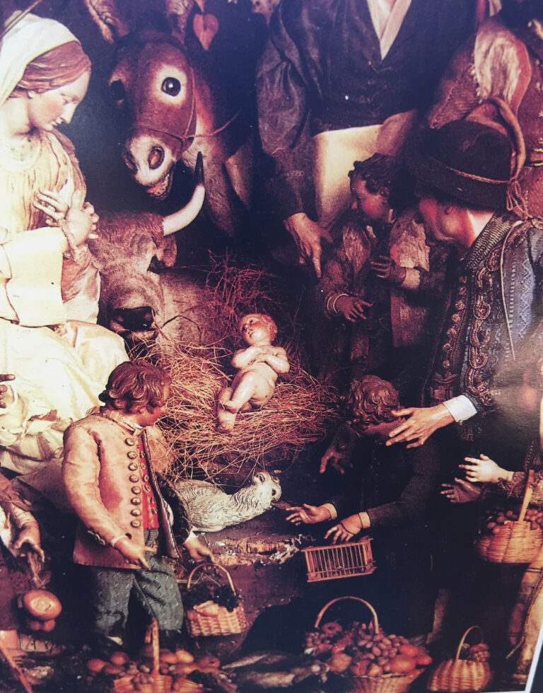 Soltanto dalla seconda metà del Settecento si diffondono presepi con figure in legno, di formato più piccolo, scolpite a tutto tondo e dipinte secondo l’usanza degli artigiani della Val Gardena.