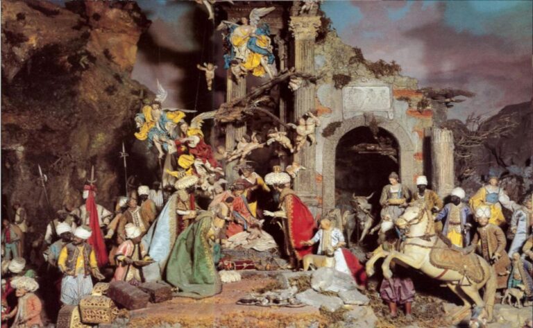 L’interesse dei Borboni per il Presepe divenne il motivo conduttore, applicabile a Carlo III costruttore degli stessi e alla devota Regina Amalia, per l’occasione sarta di figurine presepiali. La Casa reale trova un pretesto per una presenza tra i sudditi con uno strumento non trascurabile di affermazione e di propaganda. Una sorta di “dialogo” tra sovrano e popolo, un’occasione festaiola e spettacolare a sostegno di una pratica persuasiva di consenso e anche una forma comunicativa della sacralità nobiliare carica di significati simbolici. Quando, poi, verrà meno il lustro delle grandi casate e la corte con la nobiltà partenopea si defileranno da questo costoso hobby turbate dagli eventi politici, queste complesse composizioni plastiche si disperderanno nei mille rivoli del collezionismo privato.