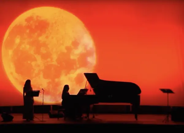 Motore poetico dell’opera è il testo Ombre di sogno di Benjamin Rosini Gutman, che nell’itinerario melodico viene declinato in diciotto lingue, accompagnato da canti originali che evocano di volta in volta paesaggi sonori di culture diverse – dalla musica yiddish alla tradizione vedica e carnatica del sud dell’India – e fortemente legati agli ambiti della spiritualità e del rito. I brani musicali si alternano a letture di testi composti e recitati dalla Gutman, sullo sfondo di pannelli sonori creati con strumentazione elettronica, che creano spazi suggestivi e fortemente evocativi di contenuti inconsci e numinosi. In Nove lune sia i canti dal vivo che quelli registrati ed elaborati elettronicamente sembrano emergere e scomparire da luoghi e culture lontani in una dimensione di sogno, e dispiegarsi lentamente in un unico grande ‘mantra di pace’ – come lo definisce la compositrice. Sullo sfondo, alle spalle delle due interpreti, la proiezione di due immagini che lentamente trasfigurano una nell’altra, opera di Giulia Bellarosa: ‘Albero cosmico’.