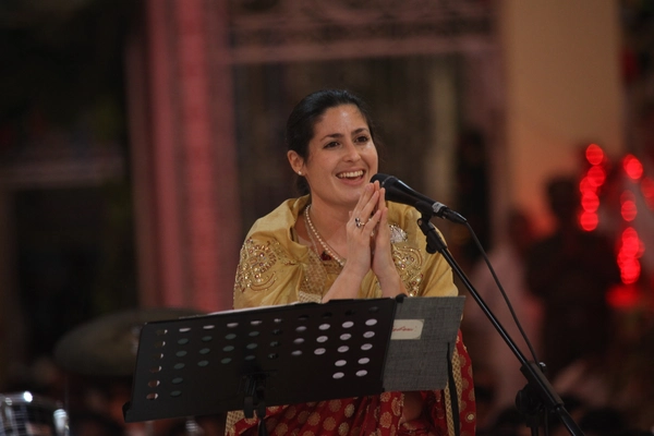 Delilah Gutman durante un concerto nel 2010 presso l’Ashram di Sri Sathya Sai Baba a Puttaparthy, in India.