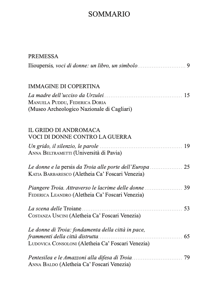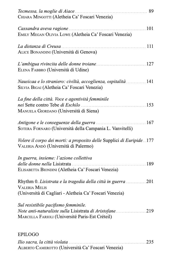 6. Il. 2.354-355. L. Consoloni, Le donne di Troia: fondamenta della città in pace, frammenti della città distrutta, in A. Camerotto, K. Barbaresco, V. Melis, Il grido di Andromaca. Voci di donne contro la guerra, Vittorio Veneto 2022, pp. 65-77 (p. 76)