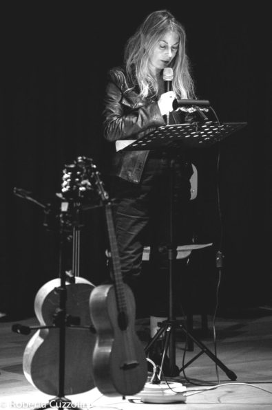 Ma ben altri quattro protagonisti hanno occupato egregiamente la scena letteraria e musicale, attraverso alcune performance che hanno inciso notevolmente sul livello qualitativo dell’evento, dispiegando un canovaccio armonico di grande efficacia. Parliamo del moderatore Giuseppe Stefanel, raffinato critico cinematografico e nella fattispecie letterario, che ha diretto il piccolo ensemble con maestria, inserendosi spesso e volentieri nel dialogo serrato tra il poeta ed il critico presente, tra l’attrice e il duo musicale, incalzando i due protagonisti con sollecitazioni ed acute osservazioni critiche, inseguendoli sul loro terreno prediletto, mettendo in scena quasi una partita di caccia sulle tracce di probabili disseminazioni poetiche, significati nascosti o non ancora svelati, illuminandone spesso le fessurazioni con richiami e rilievi esplorativi di indubbio valore semantico e filologico.
