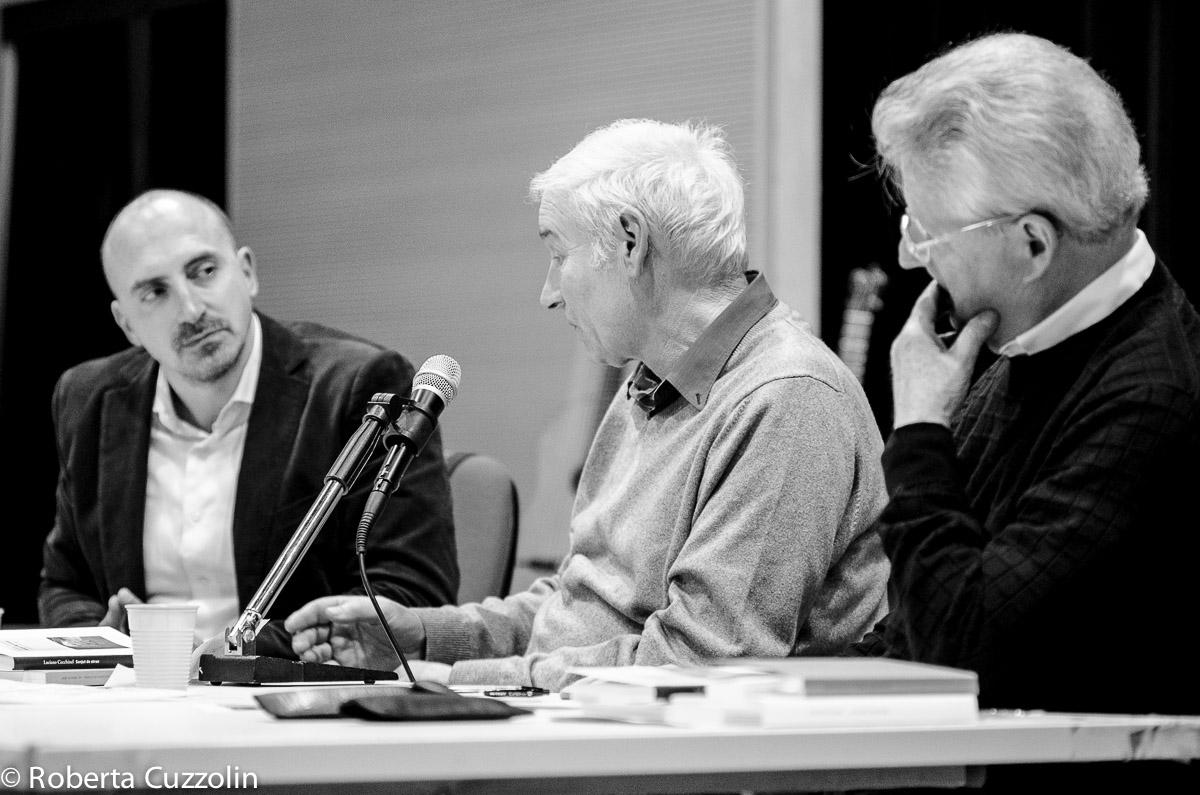 E così, il piccolo apparato celebrativo è entrato in azione: Luciano Cecchinel al centro della scena, affiancato da Giovanni Turra, che ne ha analizzato l’opera, sulla quale ha scritto dei saggi rilevanti, con il suo acume di critico e la sua sensibilità di poeta; da un critico-moderatore, Giuseppe Stefanel, che ha conosciuto l’autore da vicino e intimamente per poterne parlare in maniera autorevole, dalla padovana Carla Stella, un’attrice con nutrienti quanto importanti frequentazioni poetiche e letterarie e da Alessandro Radovan Perini e Michele Costantini, un duo di musicisti-chitarristi che ha armonizzato la serata, attraverso un contrappunto attraversato da istanze e riflessioni poetiche.