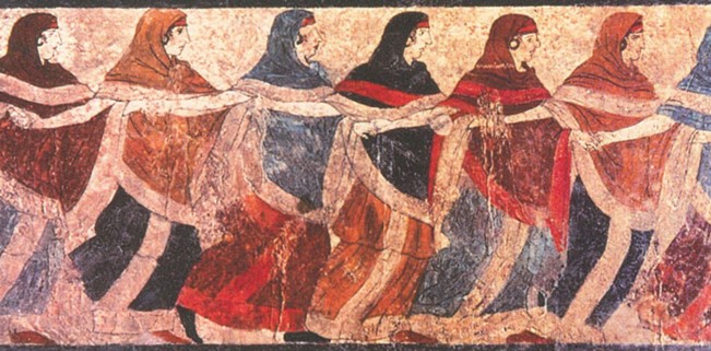 Nel corso della commedia, infatti, gli uomini biasimano più volte le donne per la loro λαλιά, la ‘chiacchiera’ vana, la ‘parola inutile’ senza valore3: prive di diritti politici, come gli schiavi e i bambini, considerate naturalmente incapaci di tenere un discorso pubblico, le donne devono tacere sulle questioni pubbliche e militari. Il motivo è centrale nello scontro tra i semicori nei versi 350-386: dapprima il semicoro dei Vecchi domanda ironicamente se debba ‘lasciar vaneggiare’ (v. 356 λαλεῖν ἐάσομεν) le Vecchie e osserva che, se qualcuno avesse già provveduto a bastonarle sulle mascelle, esse non avrebbero più voce per parlare (v. 361 φωνὴν ἂν οὐκ ἂν εἶχον); quindi ingiungono loro di tacere (v. 364 εἰ μὴ σιωπήσει), se non vorranno essere scorticate.