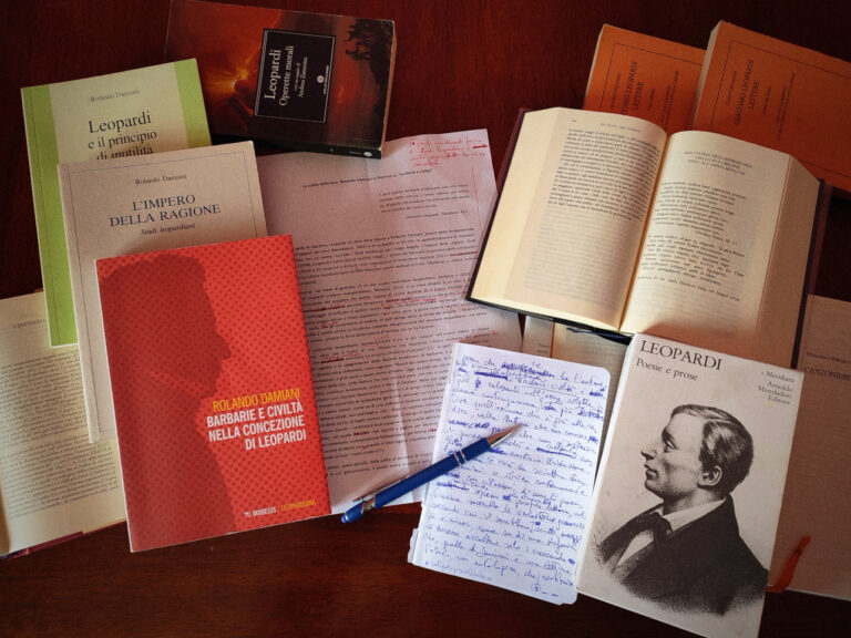 Quando si parla di Giacomo Leopardi, va data cieca fiducia a Rolando Damiani, autore della fondamentale biografia All’apparir del vero (Mondadori, 2002) e di molteplici scritti che ne approfondiscono le innumeri problematiche, tra cui vanno ricordati i titoli pubblicati per Longo Angelo: L’impero della ragione. Studi leopardiani (1994), Leopardi e il principio di inutilità (2000), L’ ordine dei fati e altri argomenti della «religione» di Leopardi (2014) e Da Leopardi a Artaud. Una costellazione di letteratura assoluta (2021); di questa incandescente fucina di studi leopardiani è esito soprattutto la ricca curatela, per la collana mondadoriana dei «Meridiani», dei volumi dedicati a Prose, Zibaldone, e Lettere, nonché dell’Album Leopardi.