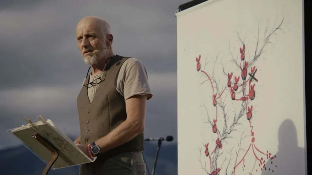 Nei primi minuti del film, dialogando con l’idrologo Andrea Rinaldo, Paolini affronta l’affascinante concetto dell’universalità di comportamento nel mondo naturale. Viene citata la geometria frattale di Benoît Mandelbrot, ovvero la teoria che tutti gli oggetti naturali sono “sistemi”, formati da molte parti distinte, articolate tra loro, e che la dimensione frattale descrive un aspetto di questa regola di articolazione (Mandelbrot 1987, p. 17). Nel saggio Les objets fractals (1975, edizione rivista dall’autore nel 1987), ciò che Mandelbrot afferma sul conto delle coste oceaniche può essere applicato altrettanto bene alle sponde di un fiume. Al netto delle variazioni naturali, dovute al vento e alle maree per le prime e alla permeabilità del suolo e alla pioggia per le seconde, i sistemi fluviali possiedono aspetti molto sistematici, quasi a mimare i percorsi seguiti dall’acqua su un terreno accidentato dopo un acquazzone (Mandelbrot 1987, pp. 113-114). Considerando coste e sponde come figure geometriche, emerge un ordine soggiacente nella loro irregolarità, un medesimo meccanismo generativo tanto dei minuti dettagli quanto dei caratteri globali. Si può vedere questo meccanismo come una specie di cascata, o meglio come un fuoco d’artificio a stadi successivi, in cui ogni stadio genera dettagli più piccoli dello stadio che lo ha preceduto. Ogni pezzetto di costa o sponda è dunque omotetica al tutto (Mandelbrot 1987, p. 26-27). Viaggiando in autostrada, aiutato dalla nebbia tra gli alberi spogli, Paolini vede fiumi come fossero fotografie bidimensionali. Ricostruisce il corso del Piave tracciando un suo disegno dall’alto, che sintetizza una sorta di mappa fluviale e la rappresentazione scientifica di un albero. Fiumi e alberi crescono verso l’alto, tracciando ramificazioni con traiettorie che si allontanano e si avvicinano in modo estremamente simile. L’immagine del fiume-albero, che ritorna spesso all’interno del film, diventa in questo senso uno degli elementi visivi su cui Segato costruisce alcuni passaggi narrativi e di montaggio. Paolini ama disegnare, usa la penna, prende appunti, scrive sui quaderni. Questa manualità legata alla scrittura e al disegno è decisamente cinematografica. Lo stesso titolo del film è stato scritto a mano dal protagonista con il suo caratteristico “font”. Il fiume-albero viene assunto ad incipit di un racconto visivo, in cui si sovrappongono le mappe che gradualmente si espandono con lo sviluppo dello spettacolo, per poi diventare quel viaggio aereo ripreso con i droni che quasi ripercorre il segno grafico bidimensionale, visto dall’alto. Si tratta dunque di un racconto prettamente visivo, carico di suggestioni colte da Segato, che parte metaforicamente da un disegno, dall’idea di fiume-albero, e cerca di restituirla mantenendo questo aspetto grafico.
