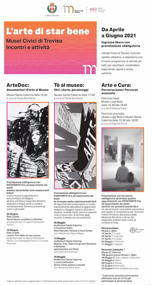 In linea con questi obiettivi, condivisi con l’Assessore alla Cultura del Comune di Treviso Lavinia Colonna Preti, riprende “Arte di star bene”, in programma da aprile a giugno 2021. È un calendario di attività organizzate presso i Musei Civici di Treviso inteso proprio ad ascoltarsi, condividere esperienze, opere e storie, nell’arte. Inaugurata nell’estate 2020 in una prima, fortunata edizione, ora la rassegna riparte il 13 aprile con cicli diversi: “Arte e cura con la Medicina narrativa” è il nuovo percorso dell’apprezzata programmazione dedicata allo stare bene nell’arte, curato da Sabina Ferro, docente in Filosofia Teoretica, Arte e Comunicazione. L’attività si svolgerà attraverso due percorsi, base ed avanzato, che avranno luogo al Museo Luigi Bailo e a Santa Caterina introducendo alla pratica della Medicina Narrativa e all’uso dei dispositivi autoformativi come la Scrittura e l’Arte. Le opere d’arte “lasciandosi interrogare” mentre verranno osservate, con l’aiuto di sollecitazioni scritte, porteranno a riscoprire nuovi nessi significativi dei nostri vissuti. Un ripensarci attraverso i cinque sensi, aperti ad un’occasione preziosa di conoscerci attraverso le emozioni.