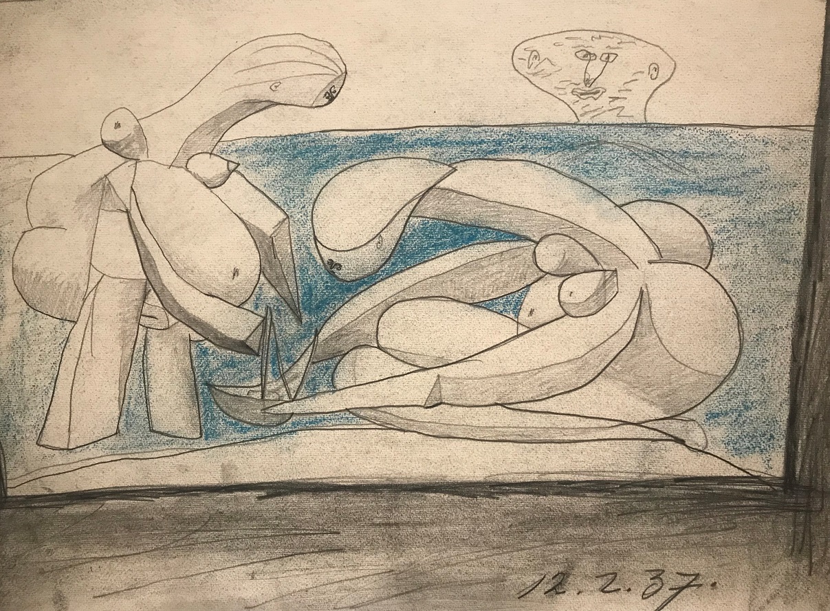Una sorta di sovrapposizioni di immagini così come solo sa fare un artista come Picasso, così onnivoro nei confronti della storia dell’arte di tutti i tempi ma direi anche di tutti i luoghi e che diventa uno straordinario «ruminante» nel momento in cui rielabora tutti questi dati velocemente assimilati e «rigurgitati» in ciò che costituisce il corredo dei suoi più straordinari dipinti come appunto nel caso de La Baignade, noto anche come Ragazze con barchetta, oggi nuovamente in mostra presso la Peggy Guggenheim Collection di Venezia assieme ai vari bozzetti, disegni e ulteriori straordinarie prove di quei primi due mesi del 1937. Un anno «vraiment terrible» se si pensa anche alle vicende personali in cui la fidanzata ufficiale del momento, Marie-Therese Walter, era in dolce attesa senza che l’artista si fosse completamente separato dalla sua precedente compagna, Olga Khokhlova e, per finire in bellezza, si stava innamorando intensamente di una nuova fiamma, la fotografa Dora Maar. Per di più divampava la guerra civile in Spagna, destinata da lì a qualche tempo, – appena due mesi dopo la realizzazione di questo dipinto, – a esplodere nell’atrocità del bombardamento nazifascista di fine aprile di quello stesso anno che radeva al suolo la città basca di Guernica.