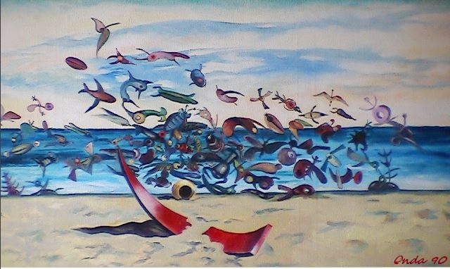 Una pittura visionaria già apparteneva ai trascorsi artistici “tradizionali” di Onda, ondeggianti fra post-futurismo, surrealismo fantastico, astrazione plastica e ricca di tracciati. Figure con assemblaggi di parti dalle sembianze naturali e tecnologiche, costruite in una spazialità metafisica, si preparavano ad occupare un diverso ruolo nelle schermate elettroniche, diventando esercizi di un linguaggio digitale, basato su algoritmi paleo-grafici ma rivolti ad un’evoluzione verso forme sempre più dettagliate e dinamiche.