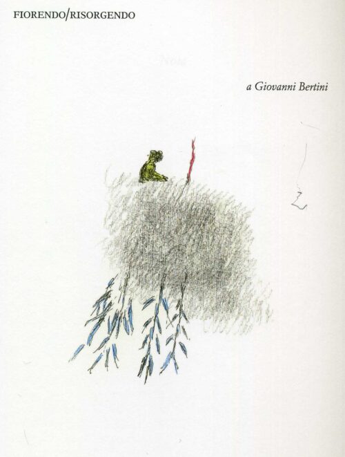 La prospettiva che si coglie nella sequenza dei «paesaggi» di Scabia è in realtà una trasfigurazione, un’apertura tanto verso «pianeti e stelle» che nel «giro vagare di atomi e altre / nominate particelle», con una estrema pacificazione che arriva ad accettare la vittoria della morte, anzi a superarla in una danza collettiva («E noi con loro a ballare»); anche il gran finale pirotecnico della partita tra gli Accademici di Stoccolma e gli abitanti dei Ronchi Palù, nel Lato oscuro di Nane Oca (che conclude il ciclo iniziato quasi trent’anni prima), ha il sapore della riconciliazione, della risoluzione dei contrasti, dopo una vittoria sul male decisamente ingenua, ma inequivocabile. Forse una delle novità della sperimentazione ininterrotta di questo poeta teatrante si dovrà cogliere anche nel rifiuto della malinconica «palandrana d’obbligo per artisti e scrittori»,12 cioè del pessimismo e maledettismo sistematici, tanto più che trovo una conferma di questo ottimismo programmatico nell’illustrazione che chiude come un sigillo i Canti del guardare lontano (p.173): un omino (o un bambino) siede su un gran cuscino (o una nuvola) accanto a un rosso bastone che ne spunta, mentre dei rami frondosi sembrano sostenere da sotto o spingere verso l’alto l’insieme, che è intitolato Fiorendo/Risorgendo. È così?