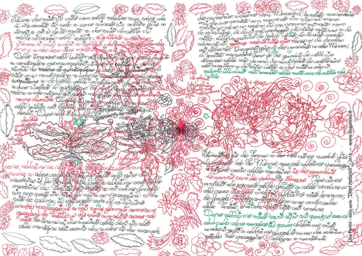 Lo spazio è conformato come una cassa di risonanza dei diari, su di un grande telo sospeso vengono proiettate le pagine dell’opera “Diari naturali”, la grande scala muta la relazione minuta con l’oggetto consentendo di entrare tra le pieghe dei segni di Lisa Perini. La scrittura scorre in modo naturale come i pensieri, s’intreccia con piccoli disegni e tracce che riportano la memoria delle esperienze dell’autore, invitando gli ospiti ad attivare il proprio immaginario personale.