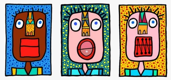 È un personaggio, Maurizio Armellin, un po’ come i suoi personaggi: guardi il viso, i capelli e senti di voltare pagina, di entrare in un mondo un po’ pazzo, un mondo da artista appunto. L’ho conosciuto durante una mostra a Sesto al Reghena, poi ho girovagato in quella Wunderkammer che è il suo laboratorio a Vittorio Veneto chiacchierando con lui per più di due ore. E come in tutti gli artisti, opera dopo opera, scopri che coesistono in lui le due facce che oramai riconosci bene, inconciliabili. Almeno all’apparenza. La vena un po’ folle che sa regredire allo scarabocchio dei bambini, sa recuperare magicamente il gusto della semplificazione (che però è profondità di sguardo), fino al minimalismo delle forme, e dall’altro lato la consapevolezza, la tecnica, la fedeltà a certe regole e a certi schemi mentali precisi. Che diventano comunicazione articolata e complessa, prima condotta ad un livello emotivo, quasi istintivo, per svilupparsi poi in forma di ragionamento, provocazione o perfino denuncia. Vedere questi faccioni, o questi totem, o questi animali stilizzati è prima di tutto bello, attira e seduce perché riporta a quella stilizzazione di forme che ci apparteneva, in cui siamo cresciuti, ma è come se ci prendesse per mano e ci riportasse dopo poco al nostro sentire adulto. Ed ecco che allora i visi non sono più scarabocchio ma ci parlano di una condizione sociale, del nostro esserci in questo mondo, ridotti troppo spesso a facce, o peggio a maschere, senza più la capacità di essere volti (è una climax che rubo allo stesso Armellin, da un suo video, segno indiscutibile di una consapevolezza comunicativa precisa).